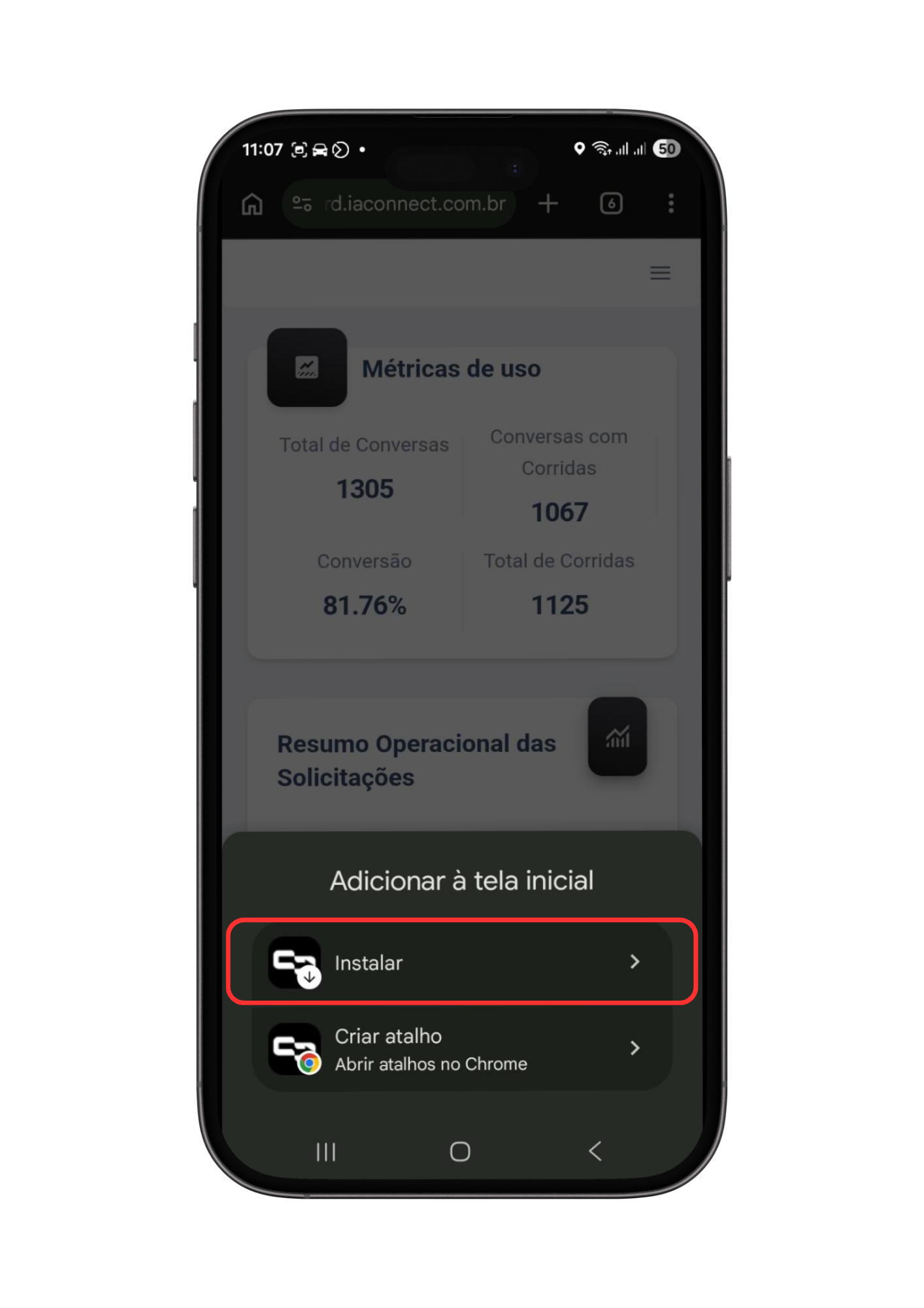 O acesso ao painel pela tela inicial não é um aplicativo instalado no celular. O painel continua sendo aberto pelo navegador, porém fica disponível diretamente na tela inicial para facilitar o acesso.